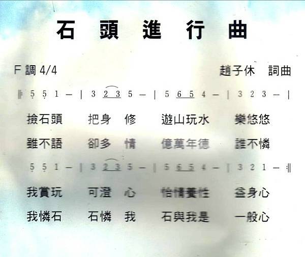雅石的歌。又是一天的開始,今天是兒童節明天是清明節,早上四點醒來,兒童節不唱兒童歌了,現在玩臺灣雅石也有歌可唱:『遊山玩水樂悠悠,億萬年德,誰不憐?怡情養性益身心,石與我是一般心。』