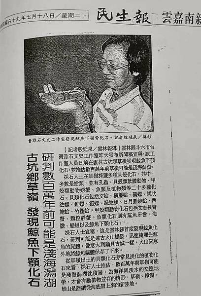 雲林縣草嶺出土鯨豚化石欣賞。九二一大地震之後,雲林縣草嶺有出土鯨豚化石,當時媒體都有報導記錄為歷史見証。百萬年前台灣是鯨魚化石之島。幾百萬年前鯨魚肋骨現身台中大甲溪河床、桃園大漢溪流域發現古鯨化石、九二一大地震後雲林草嶺挖掘出鯨魚脊髓骨化石。從古文獻上常看到「臺灣」被稱作「鯤島」,在古代神話裡「鯤」指的是一種海中大魚。荷蘭時期「台江內海」,曾經有一個古老名字「海翁窟」,環抱海岸的沙洲,即是「鯤鯓」,也因而被稱為「海翁線」。過去的大海灣,荷蘭古地圖註明為「T Walvis Been」,乃是鯨魚聚集棲息的地方「鯨骨之海」(台江內海)。雲林縣草嶺也有出土鯨豚化石,當時媒體都有報導記錄為歷史見証。
