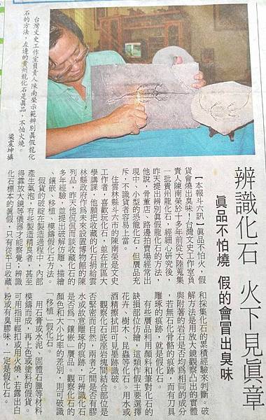 化石的真與假。石話石說以前到學校或社團展化石,觀眾都會提出鑒定化石的真與假,應觀眾的要求當場解說,解答真與假化石用火燒是鑒定方法之一,還好當時是拿真的化石燒,假的化石是用塑料壓模形成用火燒一定有很臭的塑膠味(如右圖的貴州龍化石),其實鑒定化石最好的方法是用放大鏡看化石內部的組織與結構,這一塊貴州龍化石年代至少三億年前的古生物,現在很有價值?感謝梁記者當時報導見證歷史,地球上確實有許多的真化石。