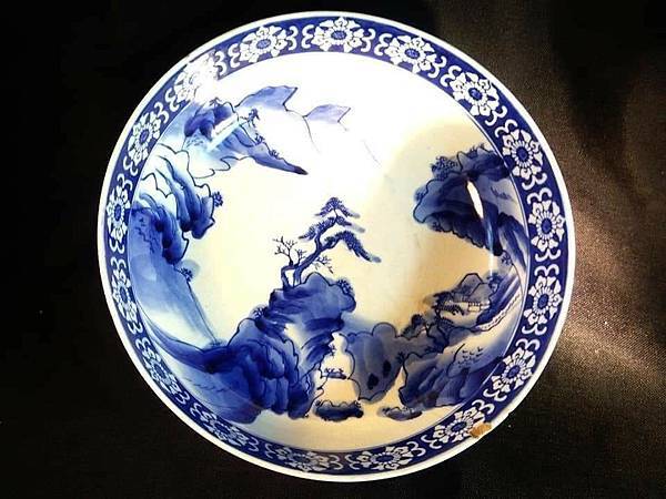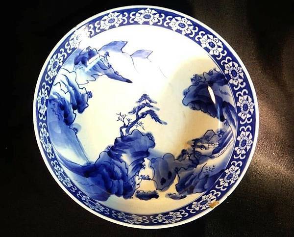 青花山水泛舟紋大碗欣賞。有年代的青花瓷器一定是手繪,畫工很細膩,用放大鏡觀看,若有先民使用過冰裂紋的歲月痕跡,應該是最美的歷史文物。(青花山水泛舟紋大碗公 。直徑25公分高12公分)攝於臺灣雅石文史工作室