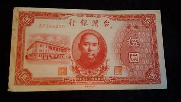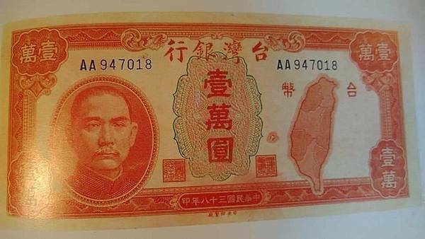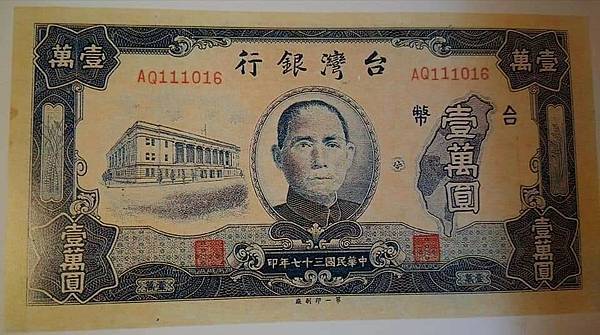 民國34年10月25日台灣光復到了民國35年5月22日台灣銀行發行台幣卷(舊台幣),幣額一元.五元.十元三種,是由上海銀行印製船運到台灣發行,以後陸續發行五十.一百.五百.一千.一萬等五種卷,當時因為國共內戰,物價猛漲,通貨貶值,趕印舊台幣十萬元,但是已經成印未及發行,政府承認發行失控造成幣值劇貶,由幾張舊台幣可以見證歷史。舊台幣由民國三十五年至民國三十八年6月15日止,共流通三年又二十三天。後來新台幣發行,發生舊台幣四萬換新台幣一元的歷史性悲劇。由幾張舊台幣就可以證明歷史的真相。