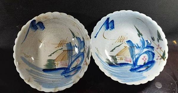 臺灣手繪山水海鳥帆船草屋紋碗欣賞。看台灣老碗能知台灣事,民國四.五十年代,為了解決百姓民生吃的問題,大量製造手繪碗公,工廠為了賣好價錢,彩繪工人發揮本能亂塗亂畫,分工合作計件賺工錢,反而成為當時老碗盤的特色,仔細看兩個碗構圖相同,紋路和顏色卻各不同藍釉青花都有應用。因為台灣夏天太熱,民國四.五十年代,百姓都夢想能到有山水海鳥草屋的地方住或渡假,手繪山水海鳥帆船草屋紋碗,表現出海島的風光特色,是收藏家的最愛。(直徑6cm)。(攝於台灣雅石文史工作室)