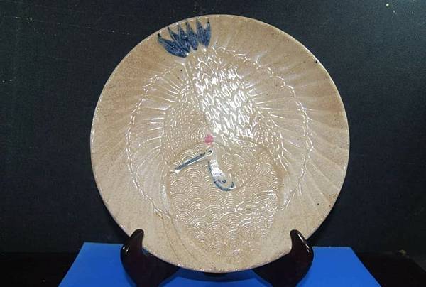 臺灣早期壓模鶴紋盤欣賞。早期製作鶴紋盤是利用模型工具,先以石膏灌入模型壓模製成,待成型陰乾後,再加以上釉高溫燒製,製作過程極為費工複雜,最後才能完成鶴盤成品。鶴的尾、頭是青花與紅單頂都是人工手繪完成。(攝於台灣雅石文史工作室)