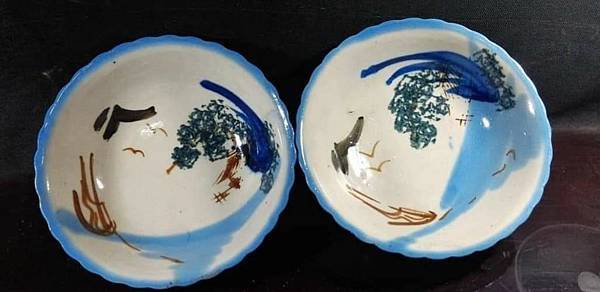 臺灣手繪山水海鳥帆船紋碗欣賞。看台灣老碗能知台灣事,民國四.五十年代,為了解決百姓民生吃的問題,大量製造手繪碗公,工廠為了賣好價錢,彩繪工人發揮本能亂塗亂畫,分工合作計件賺工錢,反而成為當時老碗盤的特色,仔細看兩個碗構圖相同,紋路和顏色卻各不同藍釉青花都有應用。因為台灣夏天太熱,民國四.五十年代,百姓都夢想能到有山水有海鳥的地方住或渡假,手繪山水海鳥帆船紋碗,表現出海島的風光的特色,是收藏家的最愛。(直徑6cm)。(攝於台灣雅石文史工作室)